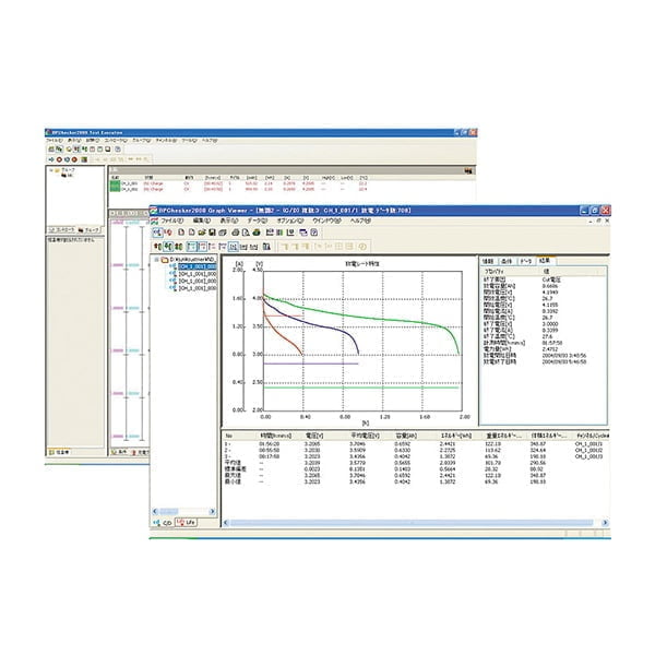 通过使用BPChecker2000,可以在PC上对电池的充放电特性测试条 件进行设定和测试,也可以对测试结果进行解析。BPChecker2000可 利用USB 端口控制 2系统的120ch控制单元 (PFX2121),因此Max可 控制240ch的充放电电源通道。此外,如果追加一台阻抗测量单元 (PFX2211),可以对连接到该系统控制单元的Max120ch 的充放电电 源通道测量阻抗。并且,可使用USB-RS485转换器来进行控制,还 可以从外部控制Espec公司制恒温槽,实现与槽内温度同步的测试。